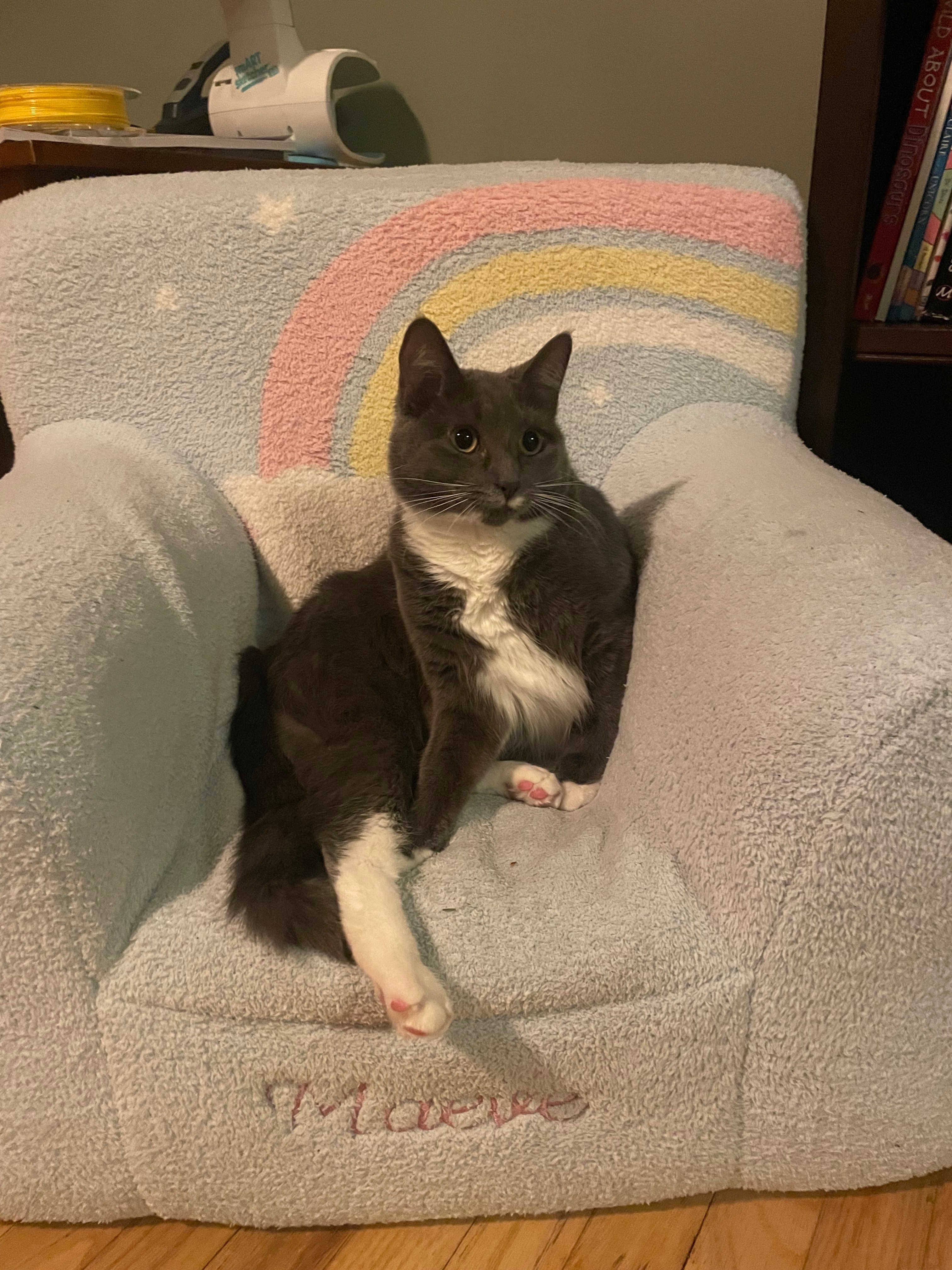 She is grey with a white belly, has never been outside. Got out in frigid temperatures. Took shelter in our backyard and was spooked this morning when we found her. She took off near royal way/ jomar estates in Shoreham.