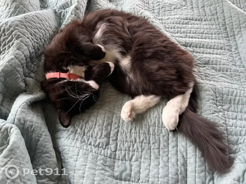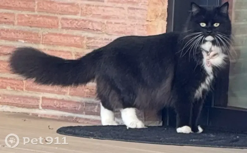 She is a long-haired tuxedo cat; mainly black with a distinct white bib that extends from her chin throughout her chest and belly, and white mittens, longer on the back paws and short on the front paws. Her tail is long and bushy, she has bright green-yellow eyes. She is extremely sweet but very shy; she does not like to be picked up and will move away if approached. She is a skilled hunter and very active outdoors. She is an agile climber and can often be found high up in trees.