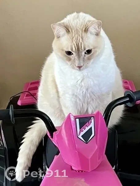 Somehow got out of house without collar. Large male mostly white cat with light orange markings on head, back and tail. Beautiful blue eyes. Indoor cat only with missing front claws. Very friendly and answers to Paxton.