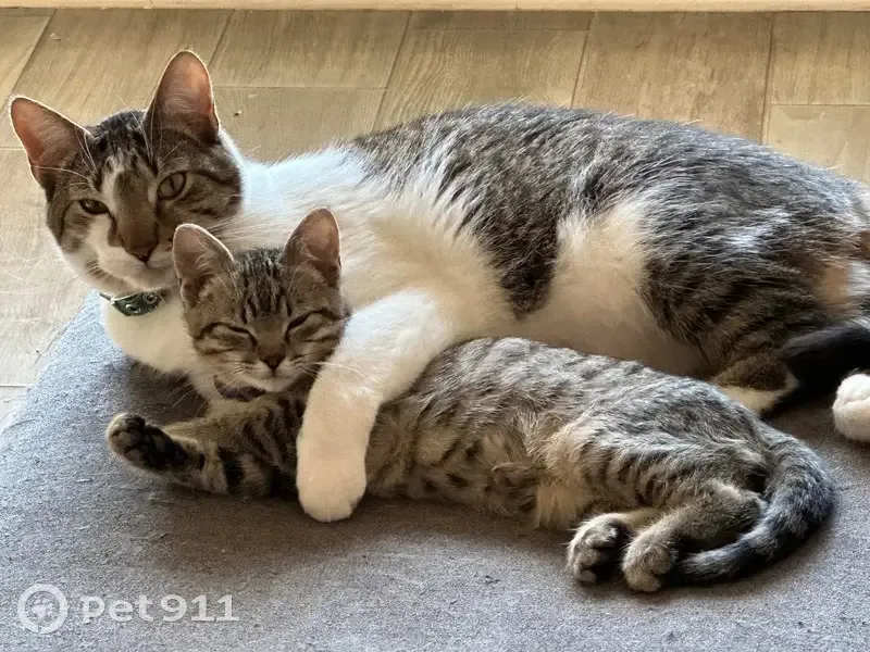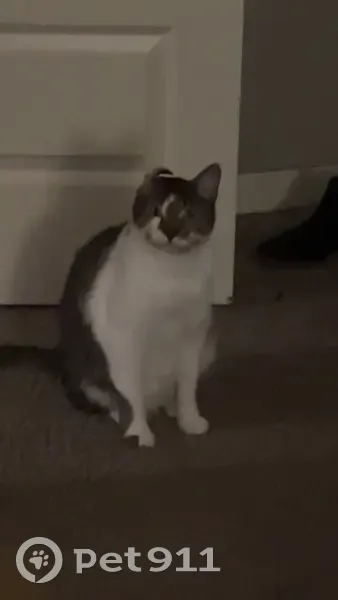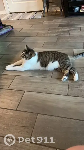 Archie is a male 4 year old tabby cat that is white with brown markings. He has a blue collar with a pink heart tag. He busted through the screen window while I was asleep but previous times he has gotten out he always returns in a few hours. He is super friendly to people.