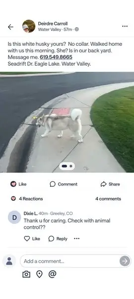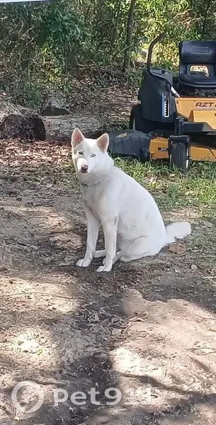 Last seen near Bohemian Hall Rd. Silverhill Alabama on Friday morning 10/10/25. Her name is Gemini but she responds to Gemma, she is an all white Husky with one blue eye and one marble eye, she is fixed and about 65lbs. She is almost 2 years old and slipped out of her harness so she is naked right now. She was staying with a family member in Alabama during a move her number is 940-210-1198