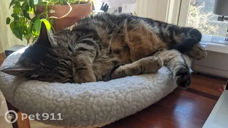 Lena is an adult tabby cat with a light brown to dark gray striped coat. She has a light brown belly. She is pretty hefty and has a belly pouch. She is an indoor/outdoor cat so she should know her way around the Prospect Hill area of Somerville. She might be wearing a "birds be safe" collar that looks like a clown collar (see pictures, she was last in the collar in the second picture). Lena is very very friendly and might request belly rubs if she is doing OK.