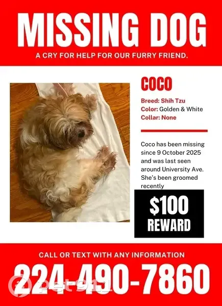 Coco is a female Shih Tzu with blonde/beige hair and little white highlights. She should still be freshly groomed as we took her to the groomers for the first time and I think it spooked her. She got off her leash that night in the backyard (while my dad was still holding it, and he should’ve been watching her for me ). She’s a very sweet girl but can possibly be a little squeamish around men or if you don’t approach her gently. Please please bring my baby home. We’re worried sick.