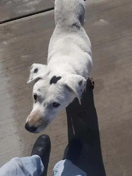 Small white dog with black and grey spots (looks like a mini Dalmatian mix) wearing a bright pink collar which has her ID tag and owner’s phone number. PLEASE DONT CHASE - she’s very skittish around people. Try to call her with food (anything but chicken - she’s allergic). She is microchipped.