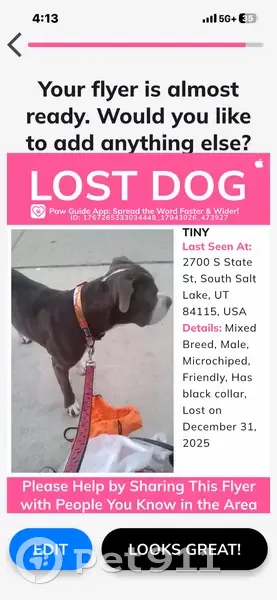Tiny is a 15 month old pitbull /boxer with a white nose and white tipped tail and a 4 white paws and on his right paw he has 3 black toenails n the rest are pink he is very friendly he got spooked from the fireworks and ran in to the road on 2700 s state street Salt Lake City and he was hit by a car and he ran off