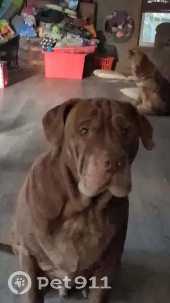 Redish brown. Chunky. Has tiny ears. Looks like an old man acts like a puppy. He is scared of thunder. He loves kids. He will come up to just about anyone. Never met a stranger. Has big chunky cheeks so big you can barely see his teeth. Never barks. Is such a good boy.