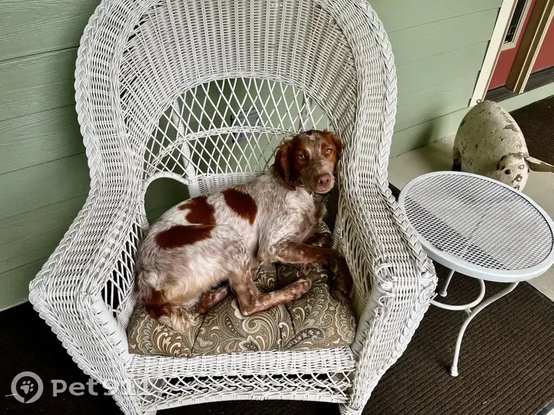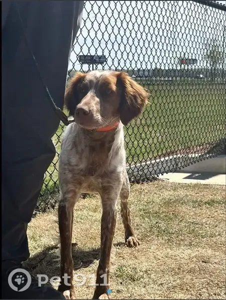 Della is a 2 year old orange and white Brittany with a beige collar with a brass plate on it, and a docked tail. She broke out of her kennel with her two male siblings in the early morning.