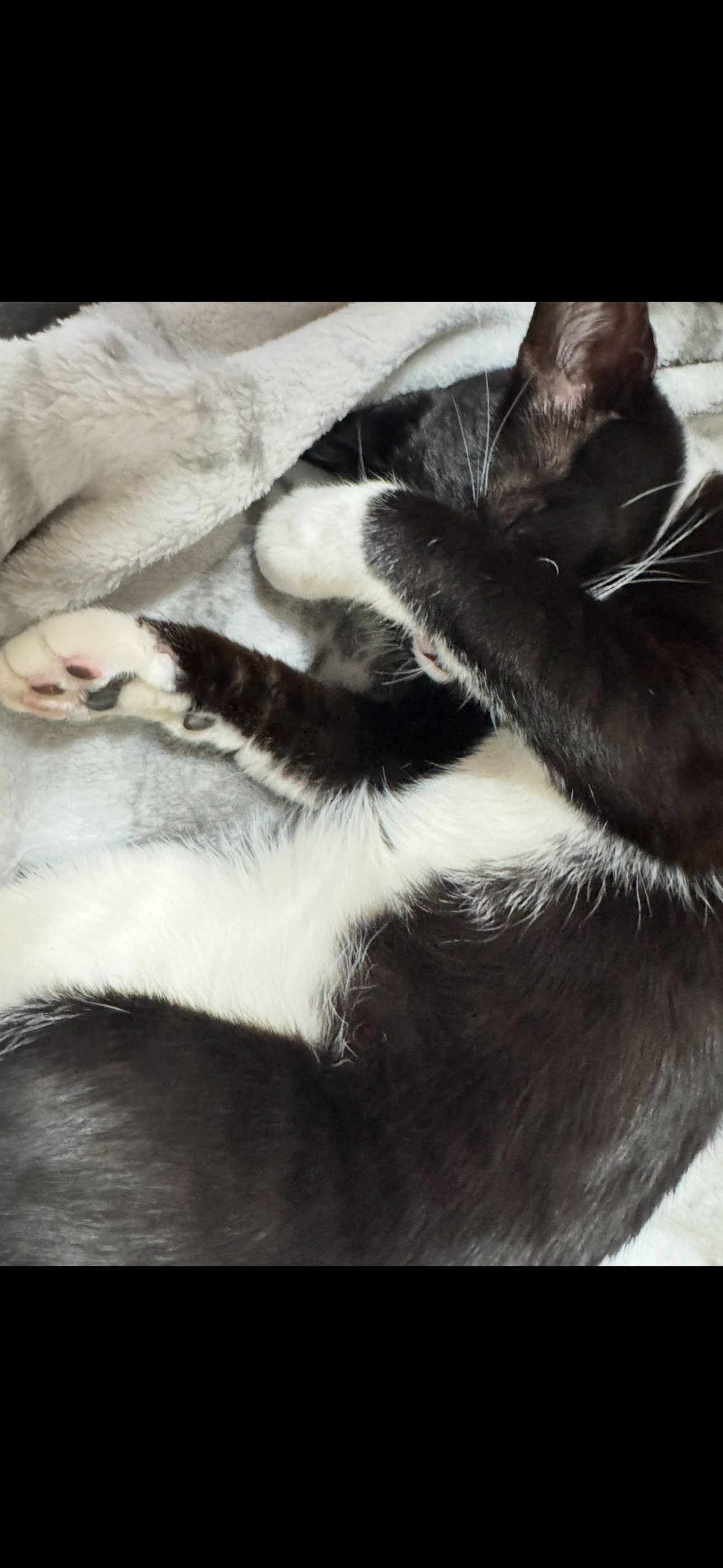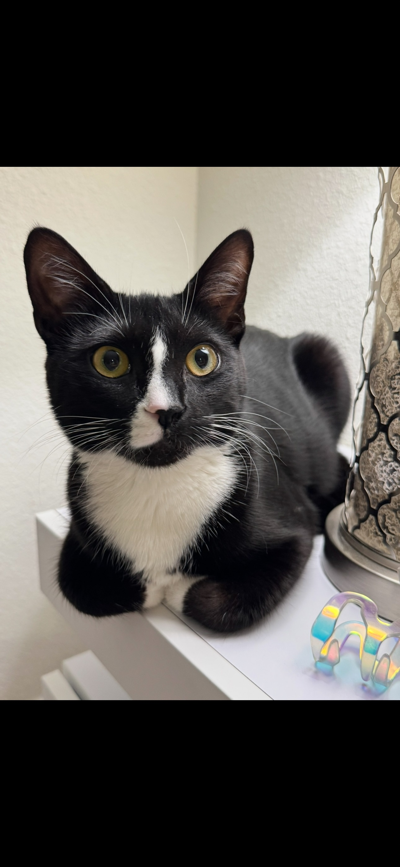 A black tuxedo cat with white paws, a white chest, and a spot on her nose was pregnant on the day she ran away from home. She returned the next day and was no longer pregnant. She is very loving, but her behavior changed the day she came back—she wouldn’t let anyone touch her and only ran away.