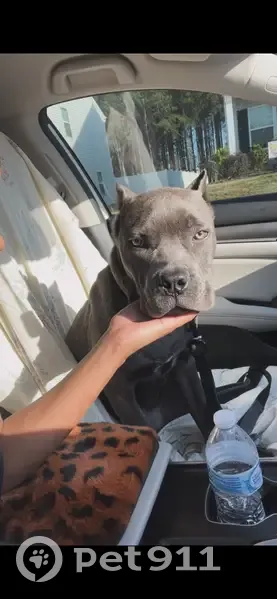 He does not have his vest on but he has his small blue Adam’s collar and a black and grey thick collar on . On his collar there is a gold tag that has his vet information on it. His ears, and tail is cropped, and he has a small cut on his lip.