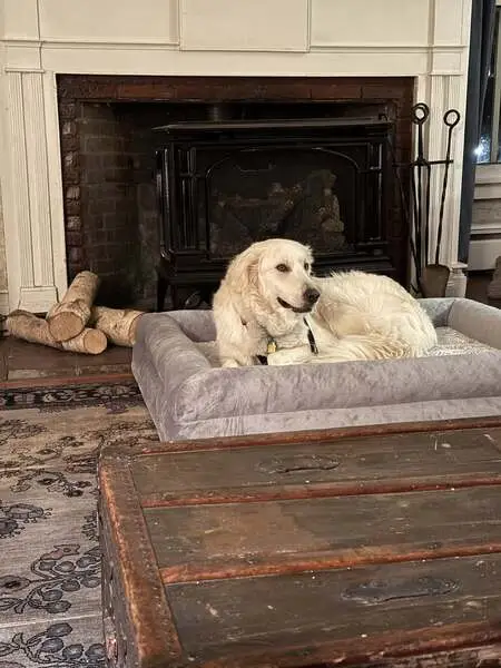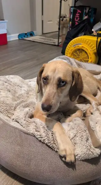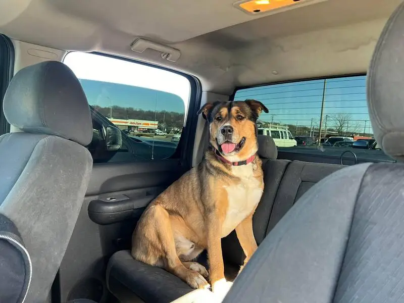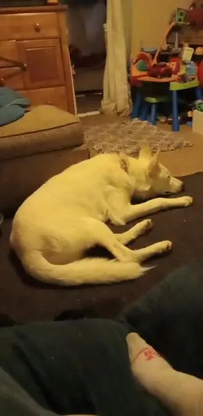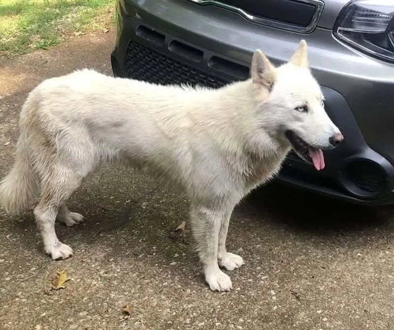Cream/light tan coat with dark German shepherd like markings. Male, appears either Husky, German Shepherd or a mix of the two. Has an army green, fabric collar. No tags or microchip. Friendly, energetic personality, barks but not excessively.