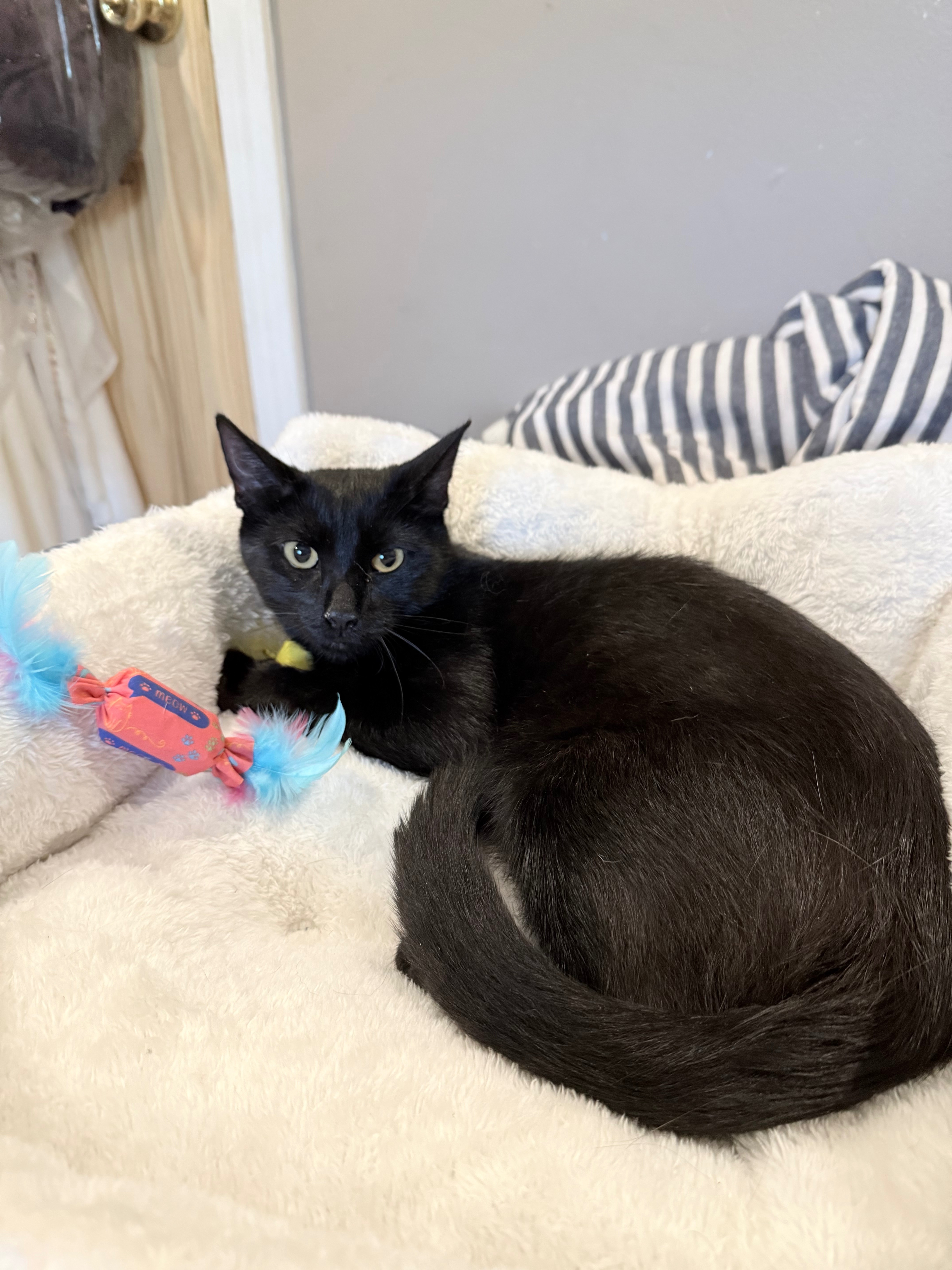 Missy is a black cat, very long and thin. She has pointy ears and one is tipped as she was a feral dog in another community but we trapped her and spayed her in August. She was living in new home happy and adjusting and there was a fire and her kitty friend died but she ran from fire EMS. The location posted is where she was last seen running