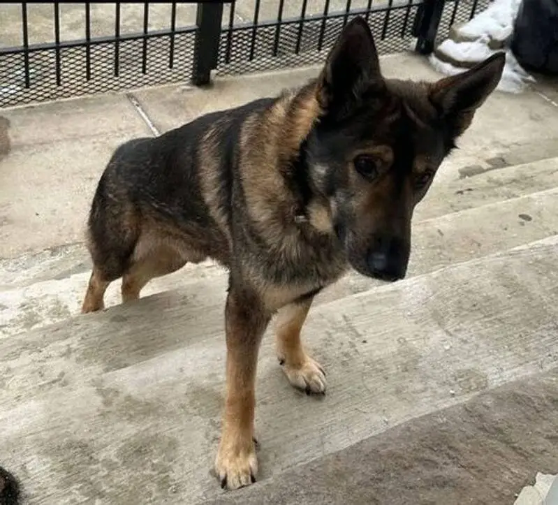 Brown , black , and slight white fur , he walks with a slight limp , he has one icy blue eye and one brown and icy blue . He responds to his same and he's very friendly . Two nights ago his harness ripped and he ran off while the people we had pet sitting him were trying to take him out. They couldn't find him .