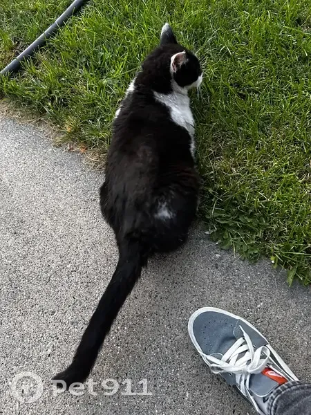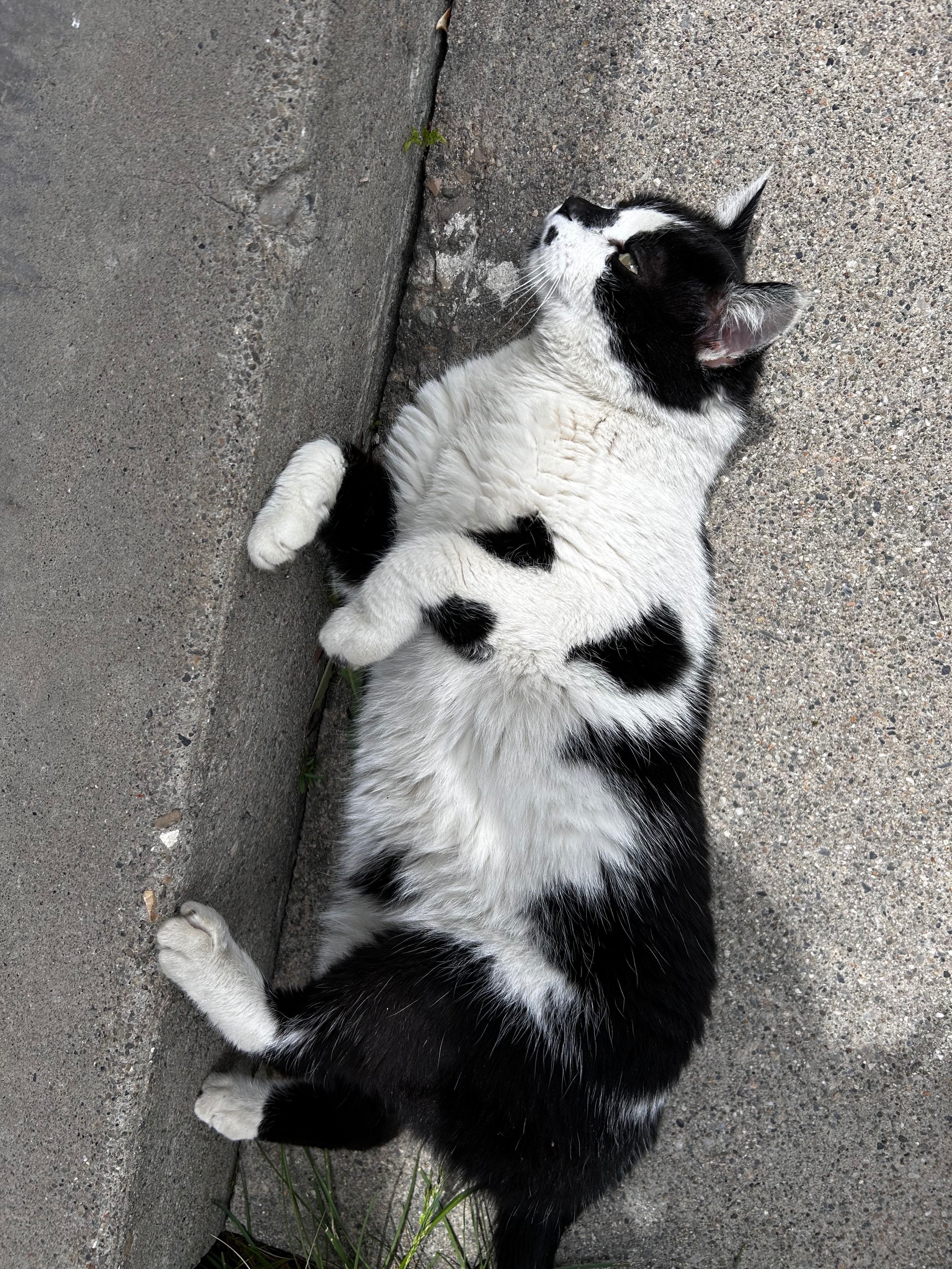 He is a black and white cat he’s got two little white dots on each side of his behind, he also has a little black dot on his face and when his legs come together they can almost make a heart
