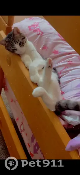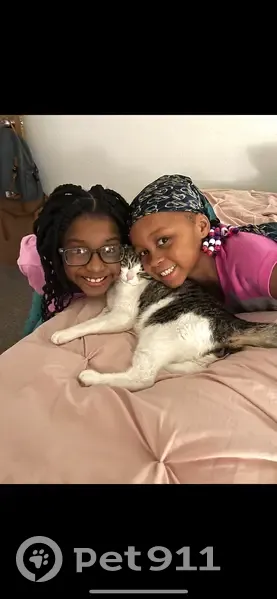 He is gray and white, he has a birthmark on his paw. He likes to look out the window and try to catch squirrels. He finally made a hole big enough in the window screen to get out and most likely ran after a squirrel.