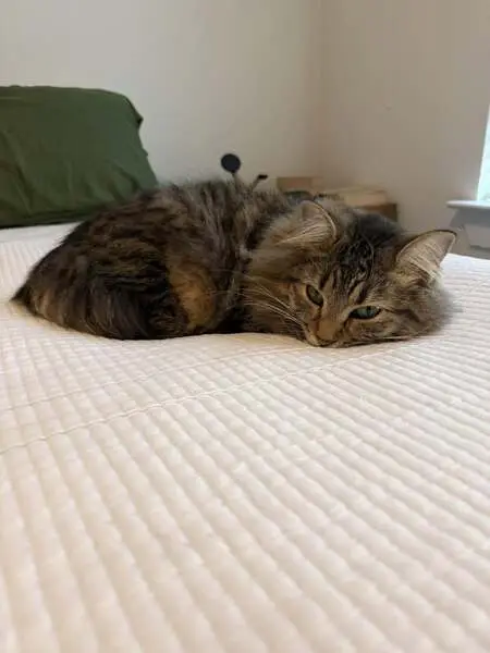 Small or young domestic medium hair, tan and brown, very affectionate. A bit underweight / bony and very hungry, but healthy coat and nails. I found her outside of a bar running up to anyone she saw. She was happy for me to pick her up and take her home. I tried to get her scanned but she doesn’t have a chip. Clearly used to being around people.