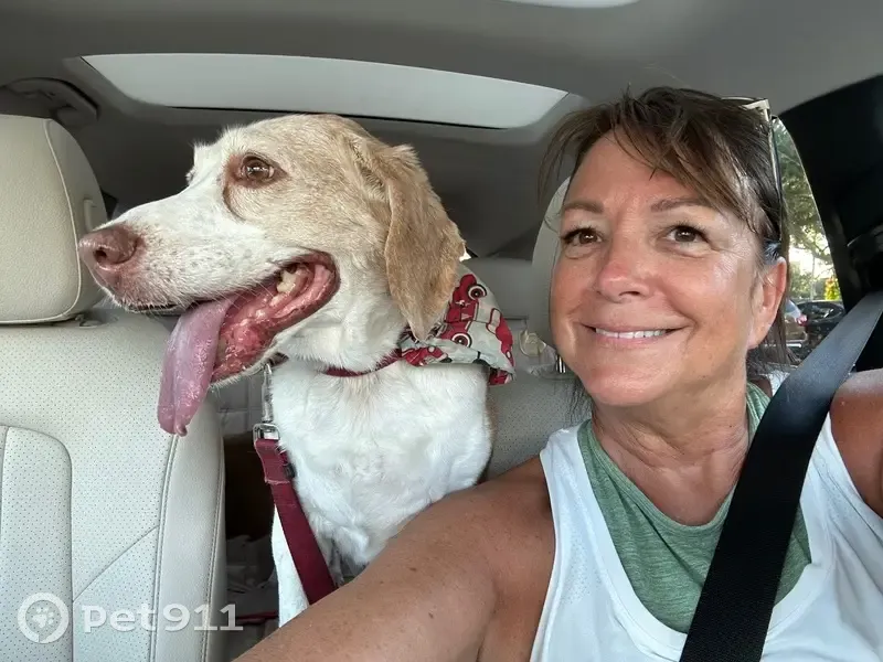 14 yr old senior Beagle, mostly tan and white, red collar w his name Watson embroidered on it, and my cell #. Very friendly!