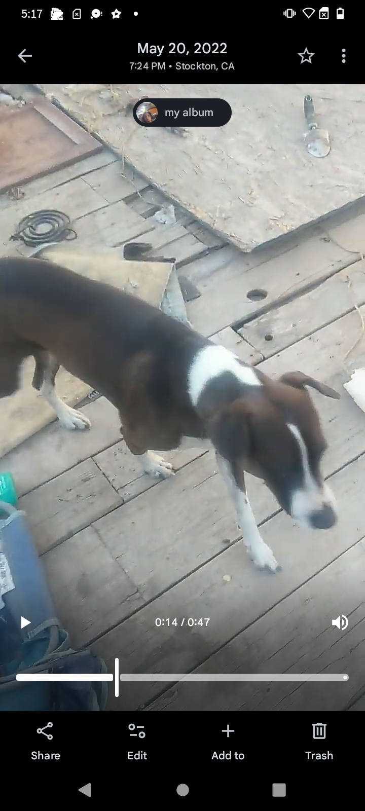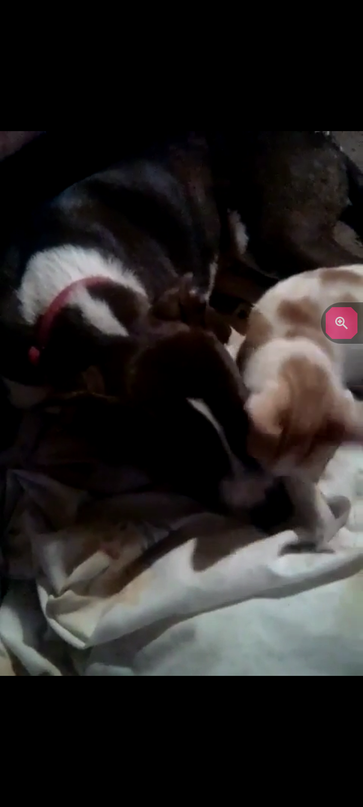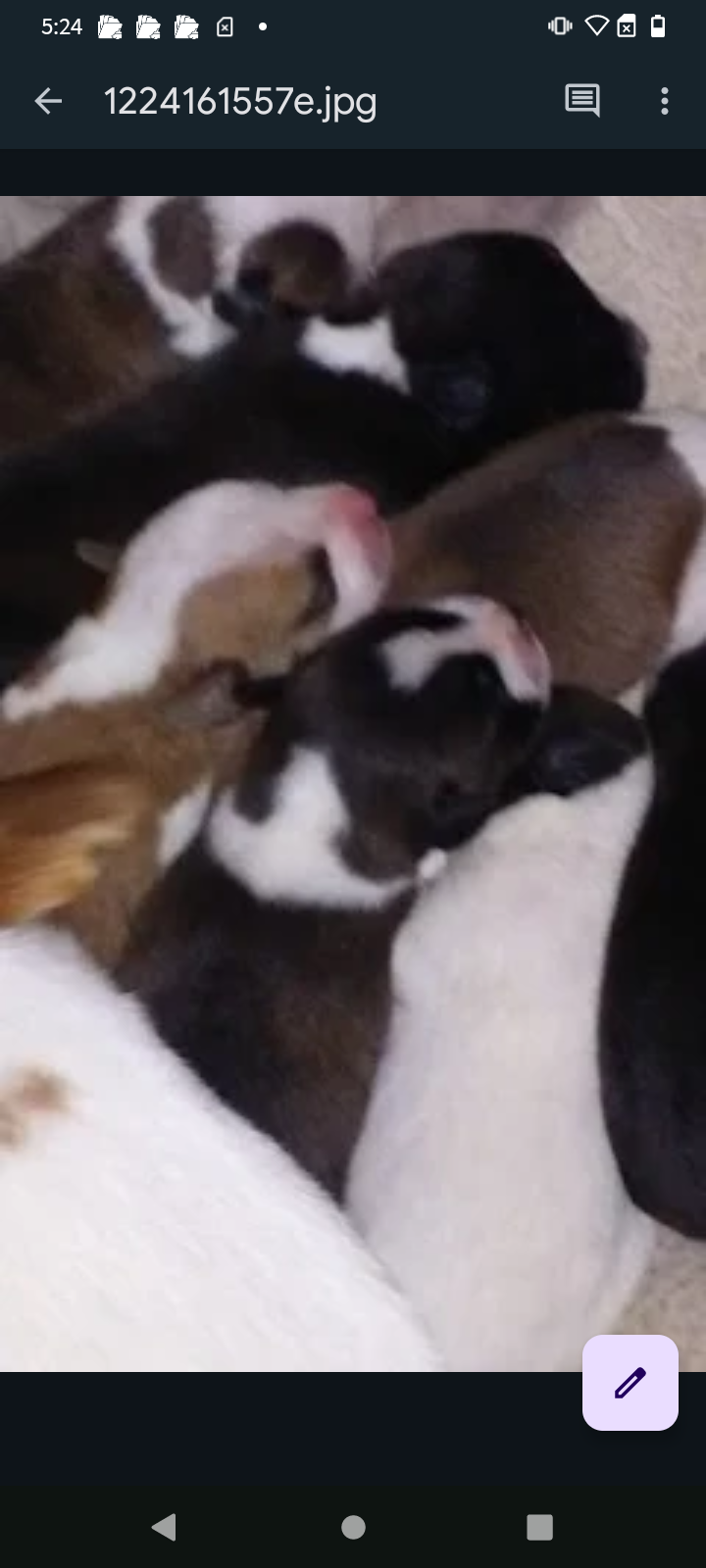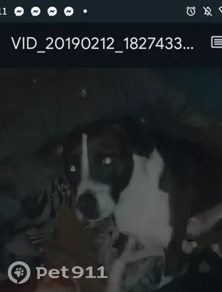Little Buddy is dark brown and white he has white on all his paws and parts of his legs his chest is white in-between his eyes he has a white line that opens by his snout the tip of his tail is white and he has a almost full white ring around his neck it's not all white theirs a little section of brown but also that ring starts to go up his head to almost connect with the line in-between his eyes but it don't connect so the top of his head is brown theirs a baby picture of him to show the top of his head and what that marking looks like he's a medium size dog skinny and very fast he might not come up to you unless you got food he jumped the gate and took off running towards Robindale ave that was the last time anyone seen of him