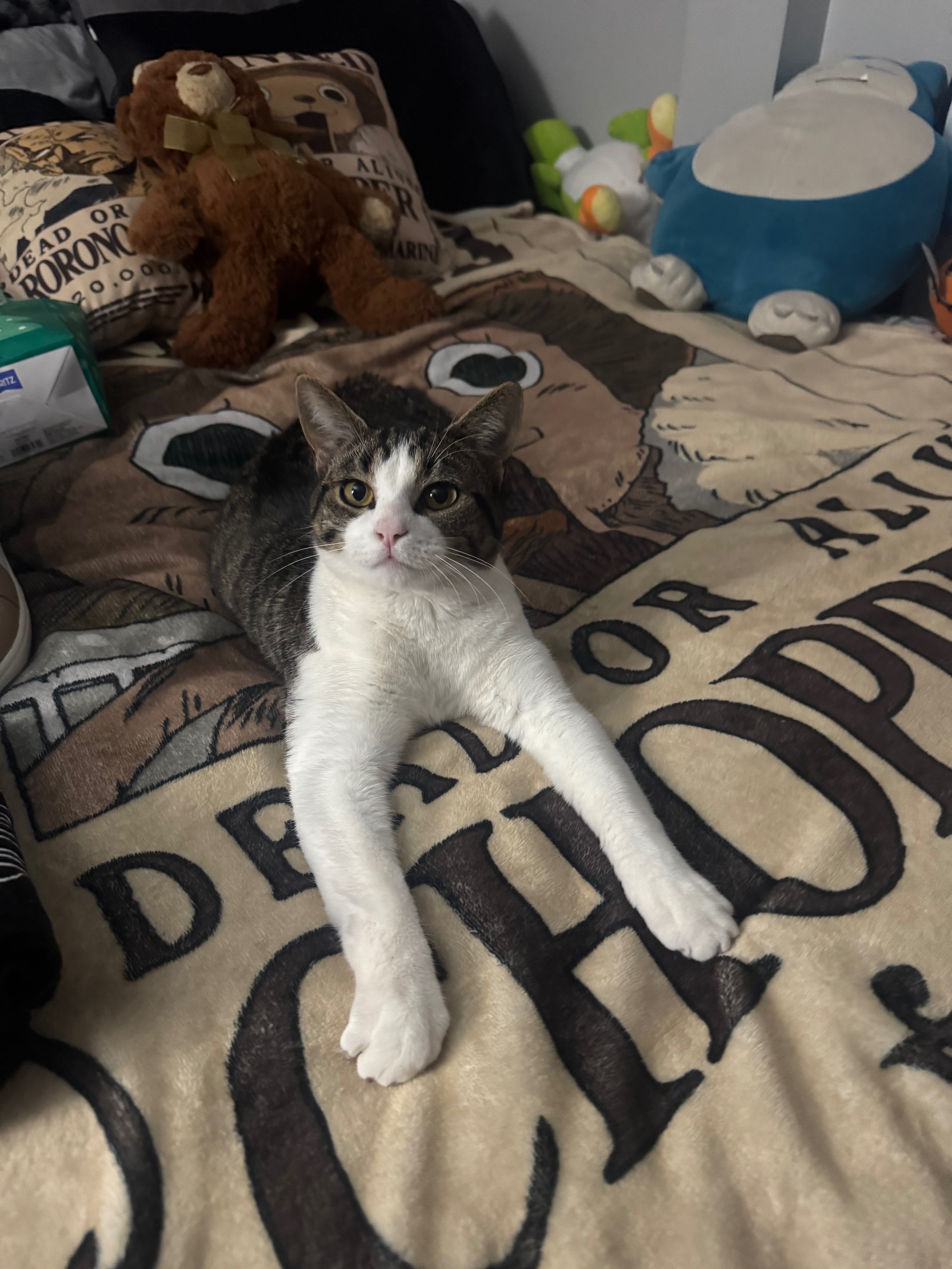 Black and gray stripes on tail and back with a white chest and pink nose. Cat escaped through front or back door without supervision. Most likely hiding on the street by a neighbors house