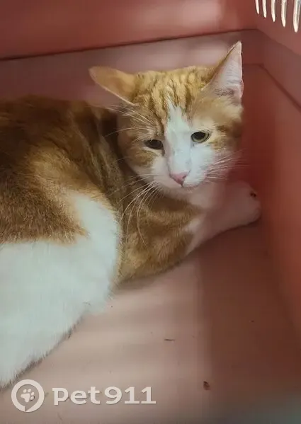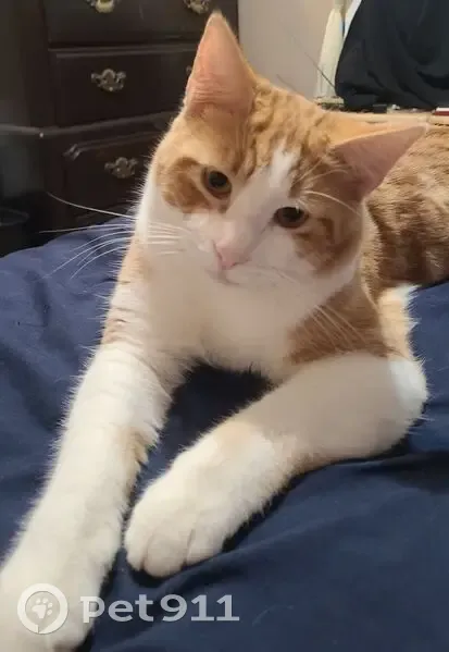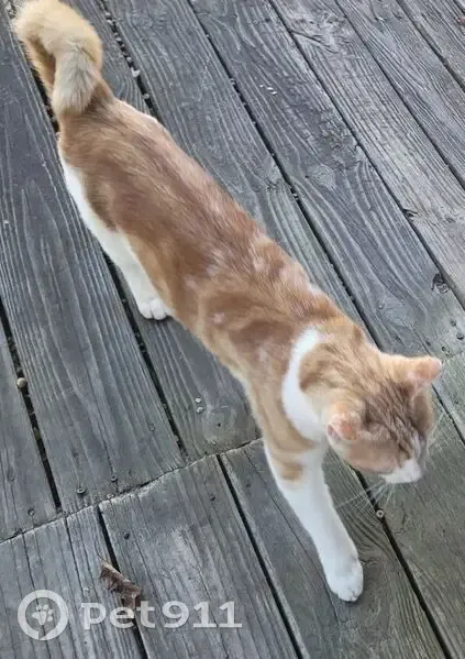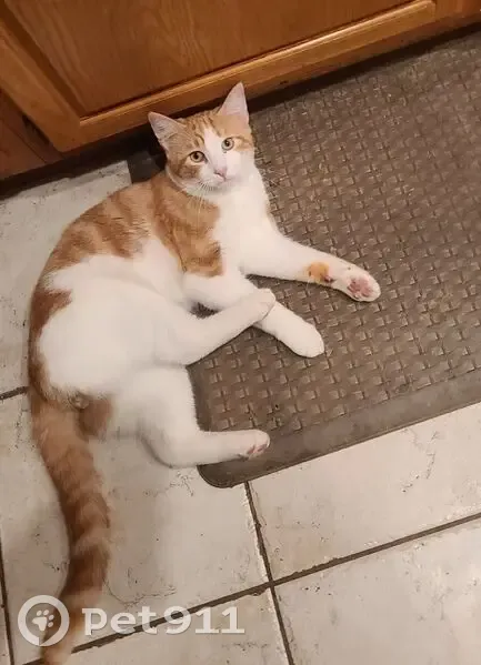 Thunder has a orange and white tabby coat. He has vitiligo so he has more white spots than some of the pics (the one from above shows them best), he has yellow/green eyes, red collar with no bells or tags, light pink nose and paw pads. He can be skittish or defensive towards new people but after that tends to be very friendly and sweet Contact at (205) 732 5042