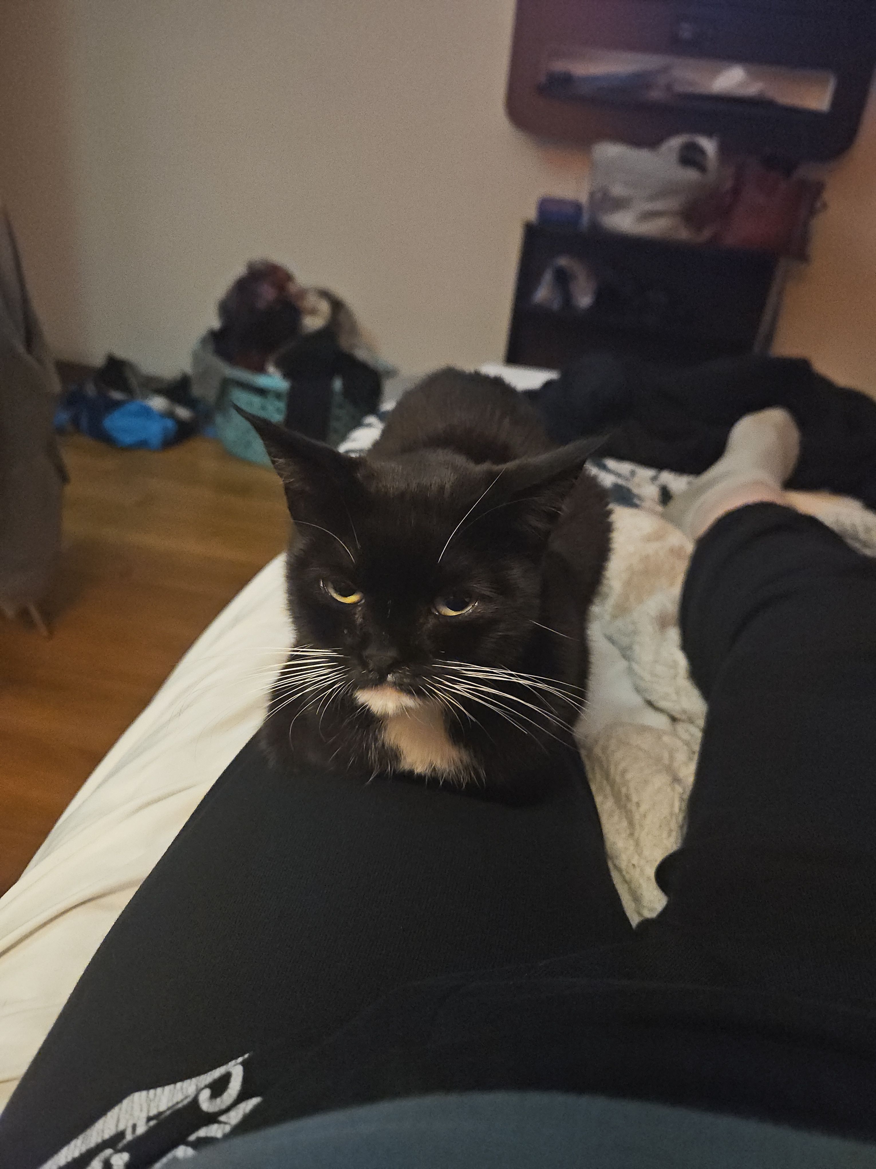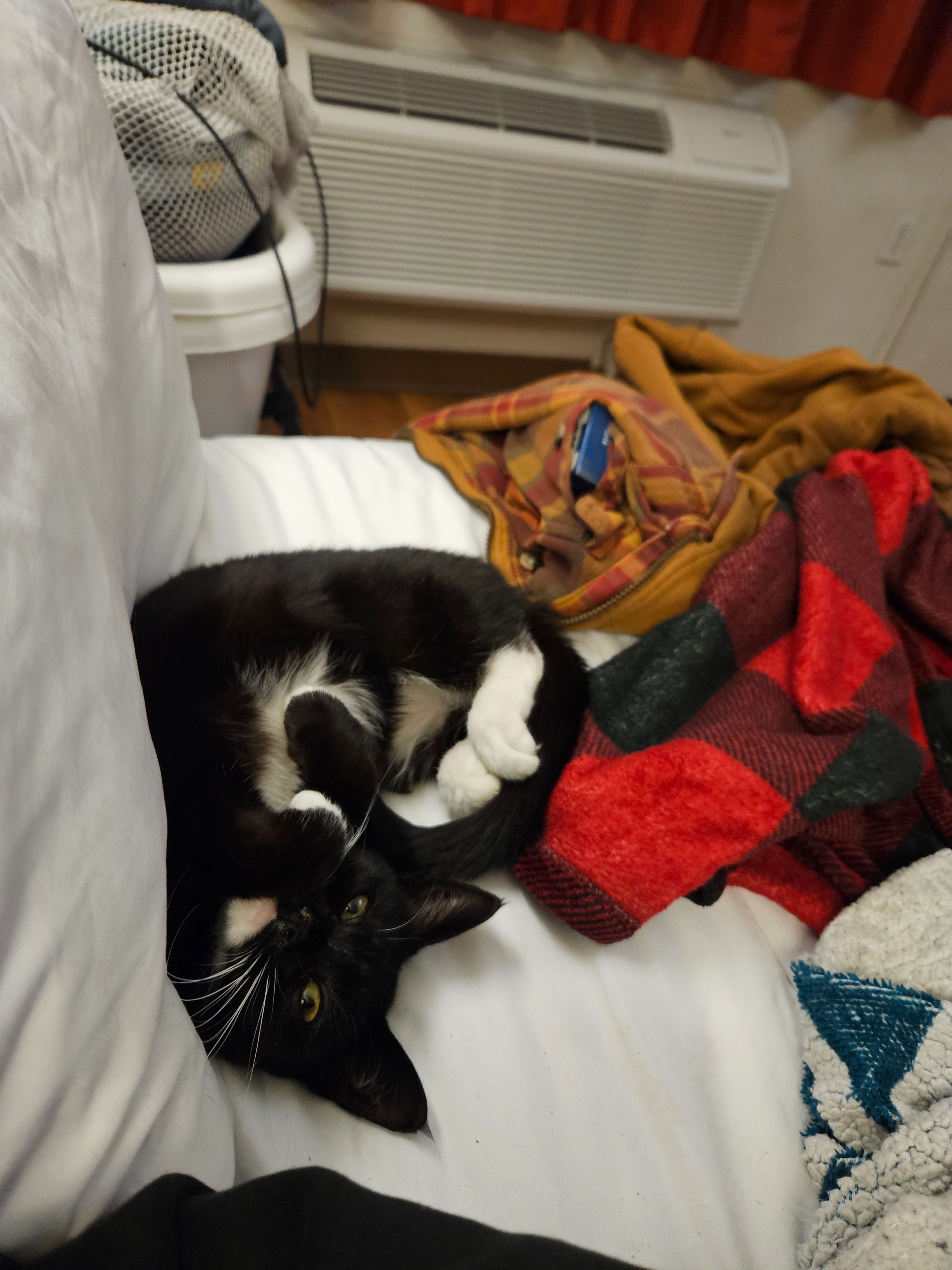 She's a tuxedo mostly black with white paws and a white strip going from her chin to her belly. She's very friendly. She's small because she was the runt of the litter but shes the sweetest kitty