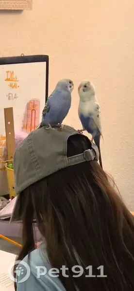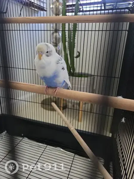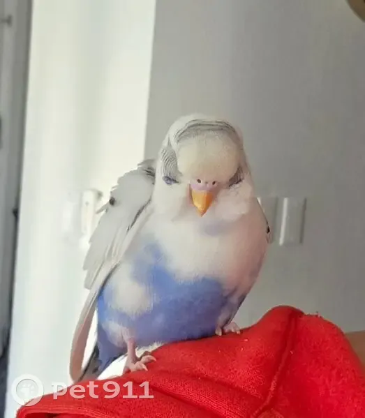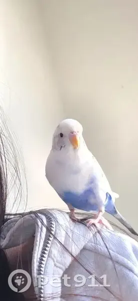 She is white and blue, but her prominent color is white. She looks like the sky! She will not let you touch her or grab her, but she will fly towards you and land on your head or on your shoulder. I had her flying around inside my house and someone opened the door and she flew right out.