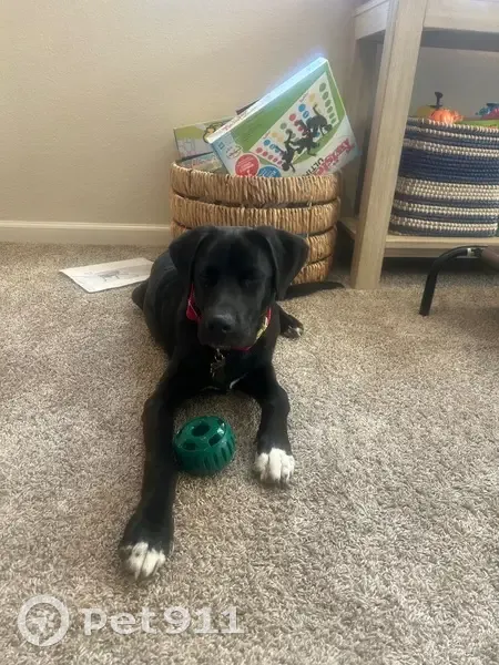Black lab mix with white patches on chest and paws. 8 months, 50# and wearing a red velvet collar. She ran out the front door of a family member’s house. She is skittish around people so she is unlikely to be easily approachable, but she is submissive if you are able to get close enough to her.