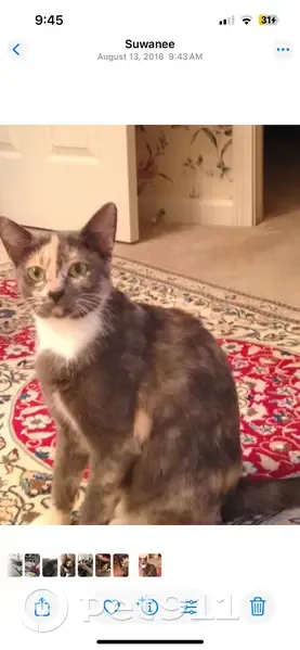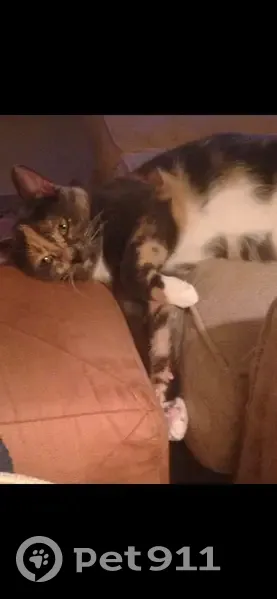 She’s calico, mostly gray & beige with white ruff (neck), underbelly and paws. She’s is NOT an outdoor cat. She’s microchipped. She’s very people shy and afraid.
