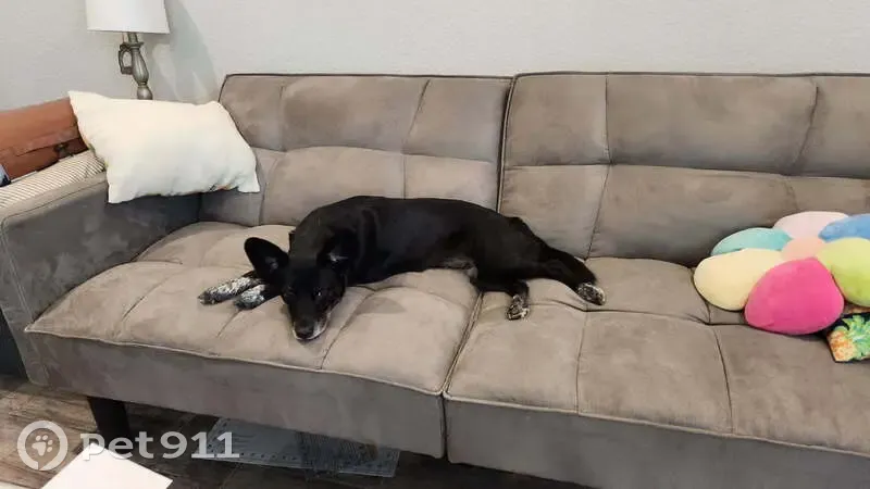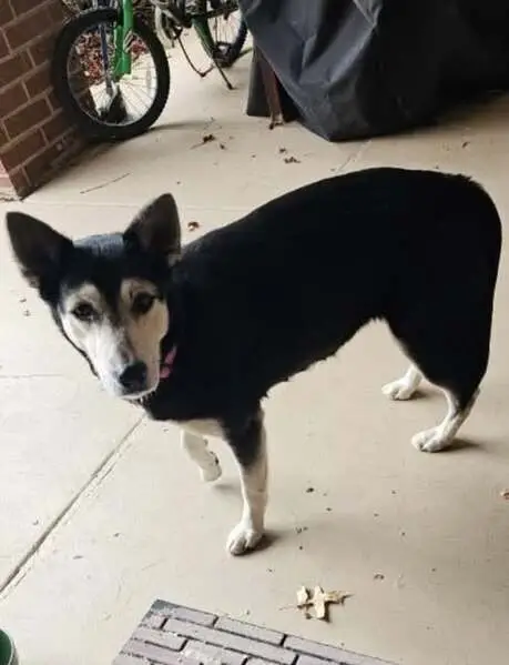 Black with white chest and chin. White and black speckled paws. Big ears and brown eyes. 25-30lbs. Medium hair length. Had black ACDC collar. Has a dyed spot on her left ear