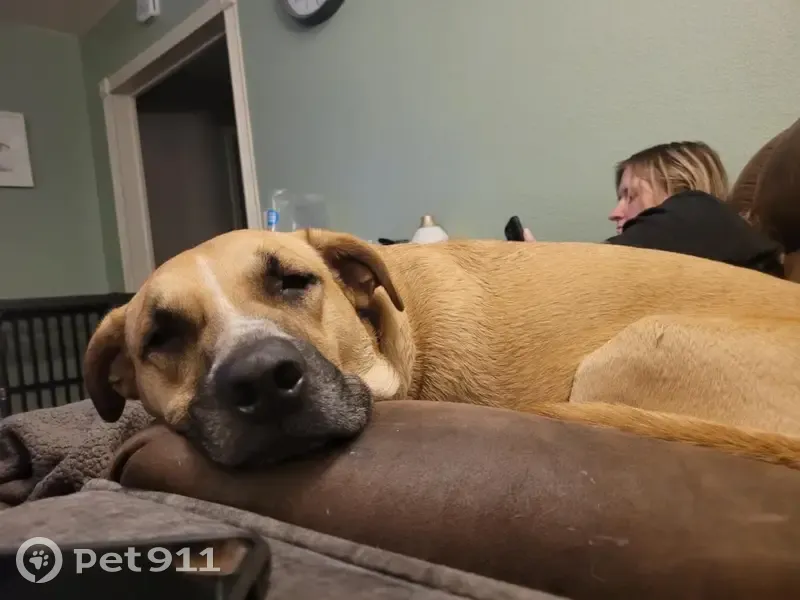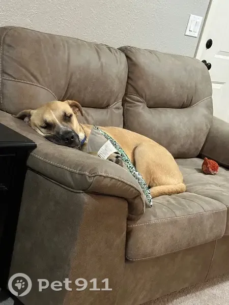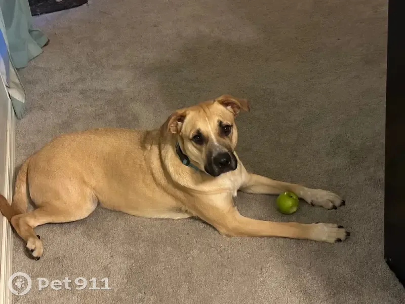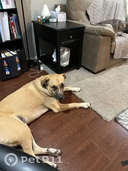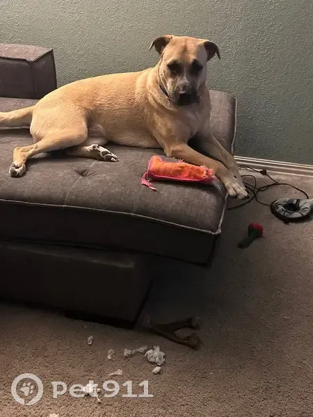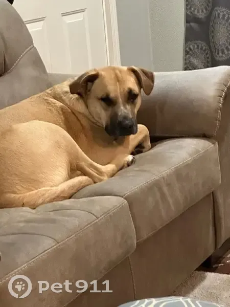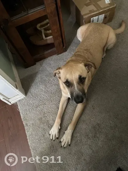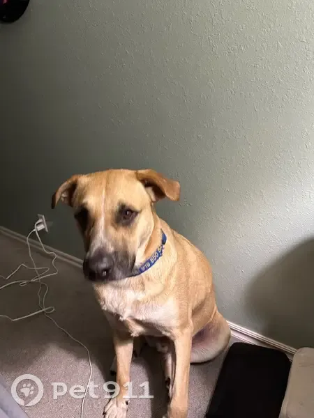 He’s tan and about 85 lbs. He has black markings on his face and a white stripe down the front of his face. He was wearing a blue collar. He has few claws on all 4 paws.