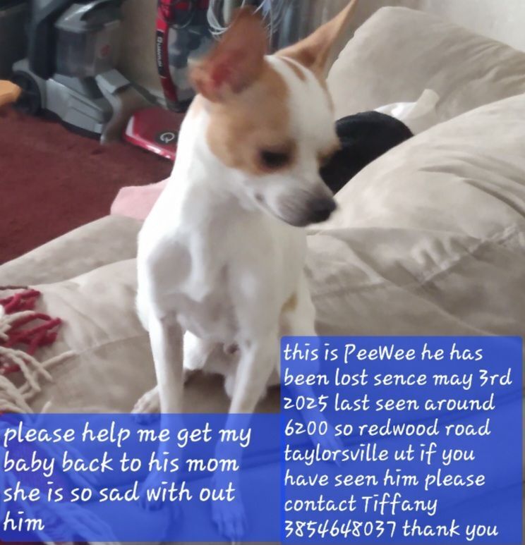 White with tan patches real small his name is peewee .. Someone took him when we were walking around the church his mom almost died having him and he is the only survivor of children she misses him so much