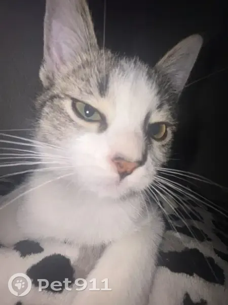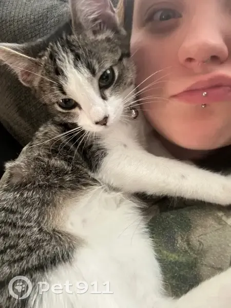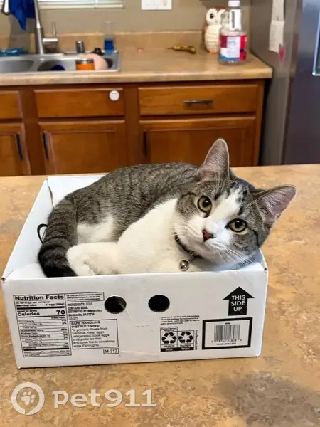 He’s a very, very sweet cat. He loves everyone. He has a collar that’s black with lightning bolts and a bell. He’s mostly white and gray, but on his stomach, he does have a little bit of brown from what I’ve noticed.