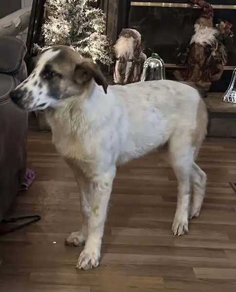 80 lb Great Pyrenees mix, white coat with brown face and brown on butt and tail. Very skittish, do not approach. Brown collar that says her name: “Ray” and “superstition farm”
