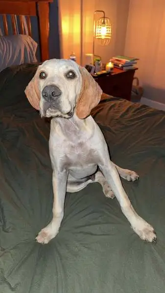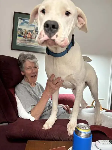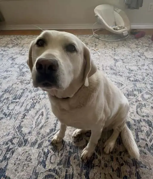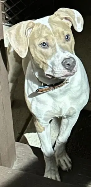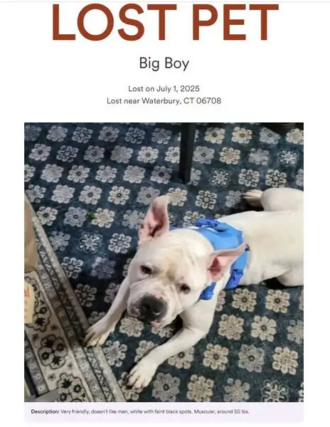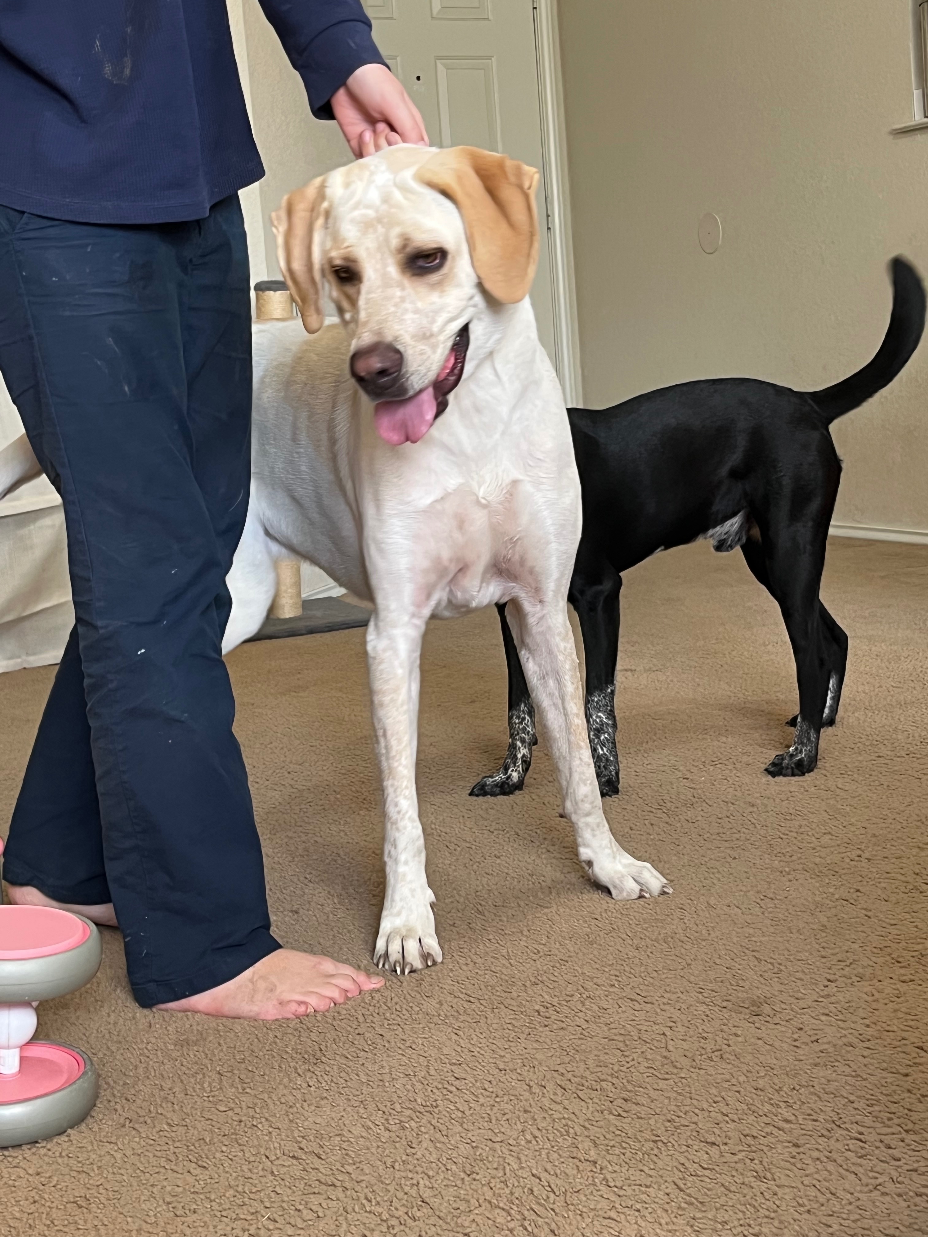 He was hanging around our culdasac from midnight til he came over to our fence at around 9am. He’s skittish but very kind and great with kids. Jumps up on you a lot. Bigger than a lab but smaller than a Great Dane. Definitely a large dog. Maybe an English pointer / Anatolian mix.
