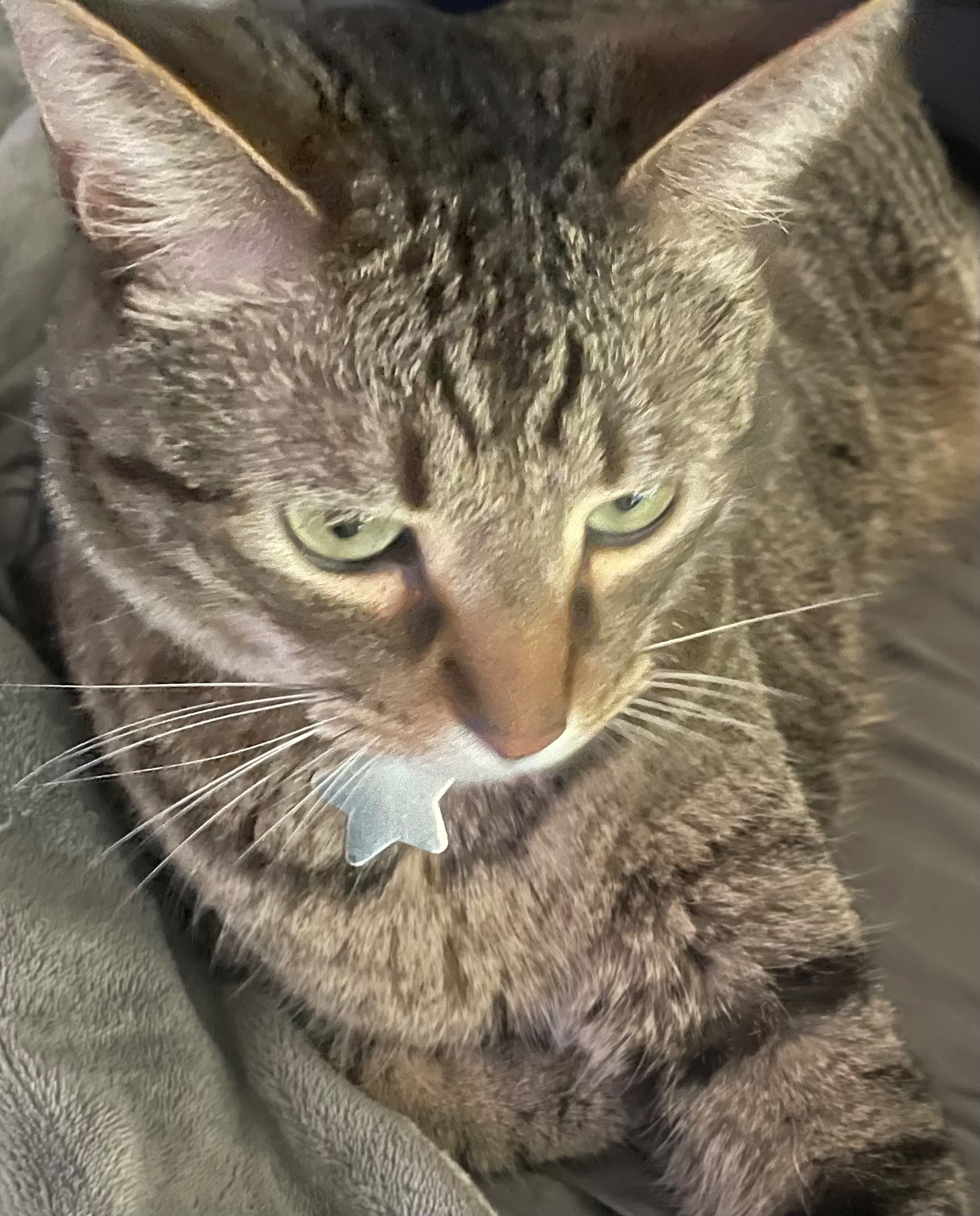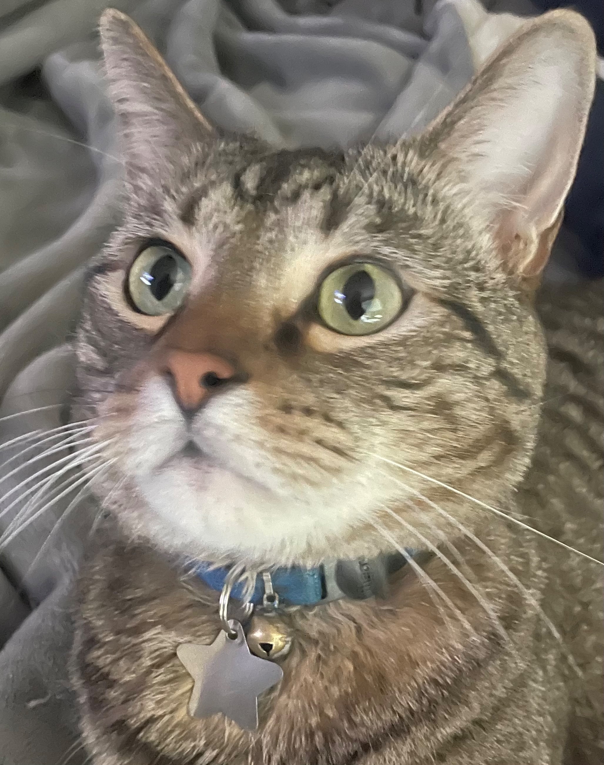 Aero is very friendly! He is predominantly gray (see pics). He has on a blue collar with a silver star name tag. He is not chipped. He is an inside cat but once was an indoor/outdoor cat. He is new to the area, so I’m afraid he doesn’t know how to get back. He is on the large size for a domestic cat. He has crazy beautiful green eyes.