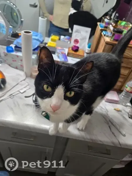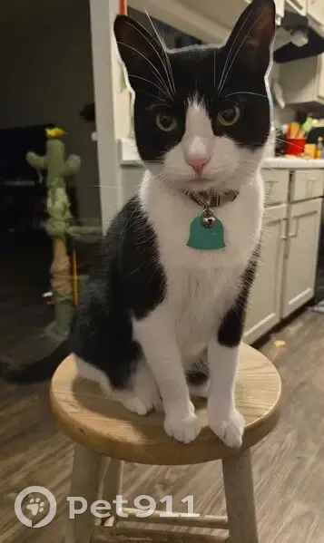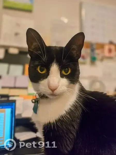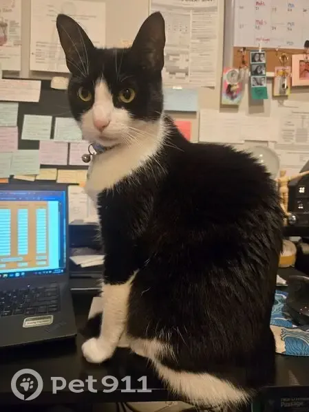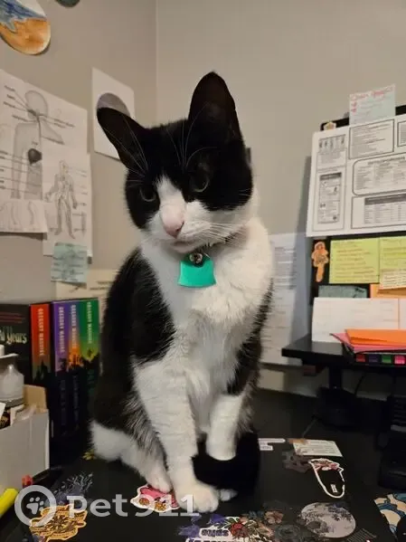 Black and white Tuxedo cat. Pink nose, collar with green tag and bell. She got out from the porch last night. She's an indoor only cat so she likely jumped in someone else's porch or tried to get in someone else's home.