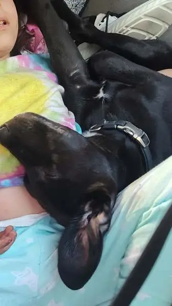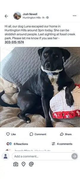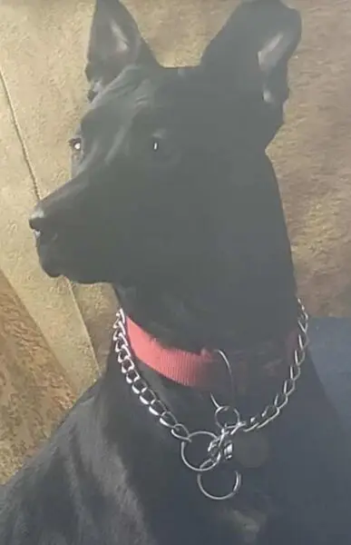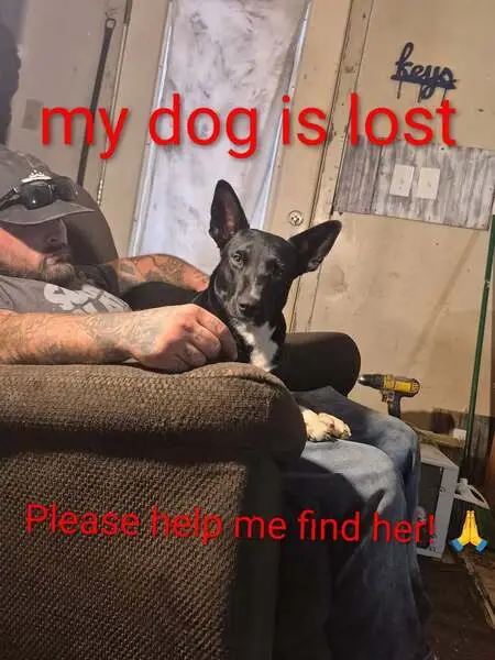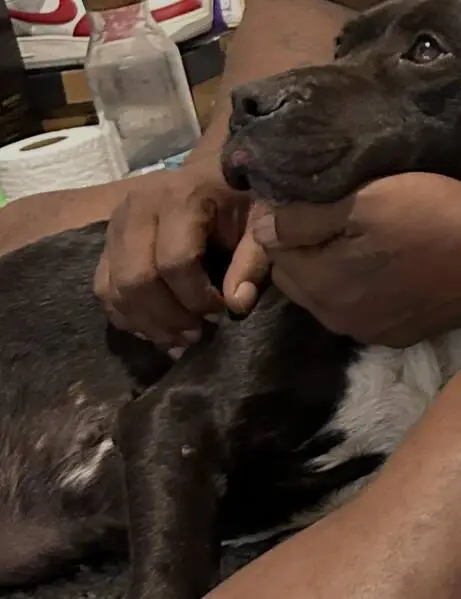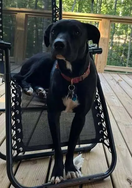 Black dog small white speckled chest small area 35lbs showed up at a friend’s house. I thought it was a puppy, the vet thinks 9-12 months old. No microchip, got him microchipped today. Had no collar. The collar in the picture is one I bought him. He is neutered.