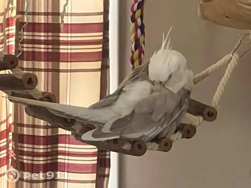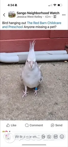 Grae is white and grey. He’s partially tamed and fully flighted. He whistles hey good looking and if you’re happy and you know it. Will respond to flock calls. Fav treats are pecans and pine nuts. He has a spot on his left foot from a recent treated injury. My dog busted the door open and Grae accidentally mistook his landing and flew out the door. Spotted yesterday in Sango. Contact info is 785-761-3084.