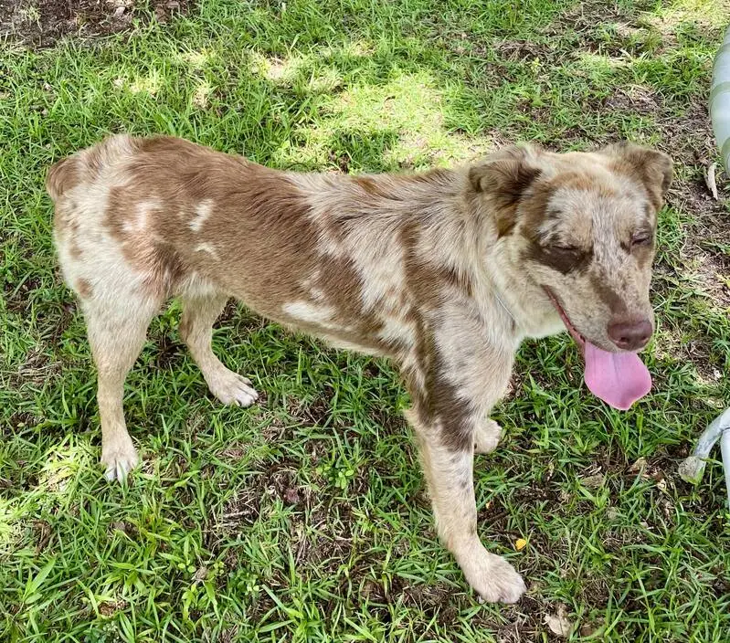 Sunshine is a medium-sized dog, about 40 lbs, wearing a blue collar. He has a unique coat with a mix of light brown and gray fur and striking yellow-green eyes. His ears are floppy, and his tongue often hangs out when he’s warm or excited. Sunshine is very friendly and does not bite. He was last seen going inside the Providence at Champions Apartments. If you see him, please approach gently and contact me immediately.