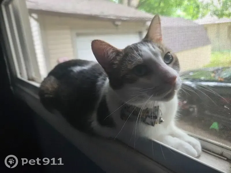 He has a blue and black bow tie collar. He is declawed in the front (not my choice) and he is fixed. He is really sweet, but would probably run if approached too fast. He has a patch on his right shoulder and is brown, tan, and white.