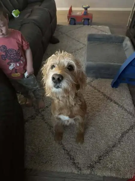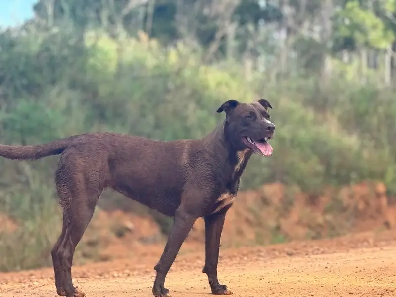 This is a brindle-colored mama dog who had ticks on her body. She is incredibly sweet and just wants someone to pet her and love her. She is believed to be a Pitbull mixed with something else that I'm am unsure of. She was found with two puppies, a boy and a girl. The boy has already been adopted, but the girl remains with us. When we found her, she was exhausted from the heat and was extremely underweight, almost seeming as though she wouldn't survive the first two days in our care. She showed positive signs of having worms, but she has been dewormed and is now on the road to becoming healthy and happy again.