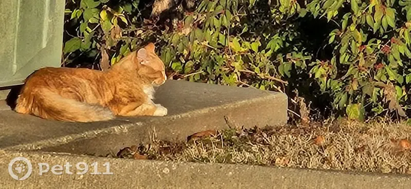 Orange and white long hair. Slanted eyes. Friendly and calm. Hanging out by my truck as I left to go back to work. Behind Kwik shop at 4:15 pm 11-16-25