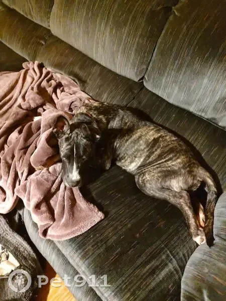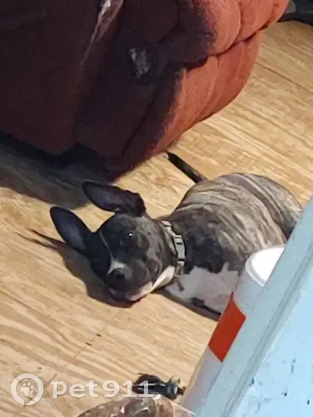Blackish brown fur, white patch on the chest and on his face that reminds us of Pepe Le Pew, weighs about 50 pounds. He has a collar, but no ID with it. He's 6 months old and very friendly, doesn't typically bark unless he wants attention or back inside from being outside