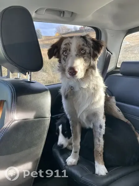 He is a red Aussie with dark brown and tan splotches and a silvery white coat. He has heterochromia and Iris Hypoplasia in his eye. He was wearing a Hooey collar with a MVVS rabies tag and a HomeAgain yellow tag. He left our house because of unknown reasons. We think he got lost by finding a dead animal or chasing a critter and got to far out. He is only 9 months old and very friendly.