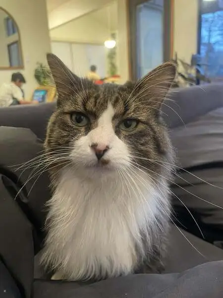 She’s all white on chest, front paws, and muzzle area the rest is black and brown/tan LONGHAIR! Green/yellow eyes with pink collar SNICKERS 609-331-1800