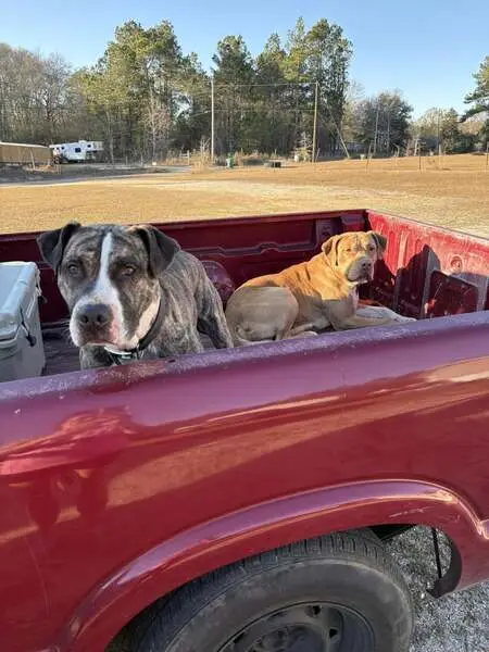 I found a grey and white male pit bull wondering around and didn’t want to leave my yard he is really friendly towards people and other animals.