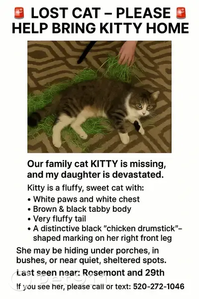 By following these steps and utilizing the resources available in Tucson, you can increase the chances of reuniting with your beloved cat. Remember, persistence is key in any search, and with the community's help, you can find your pet.