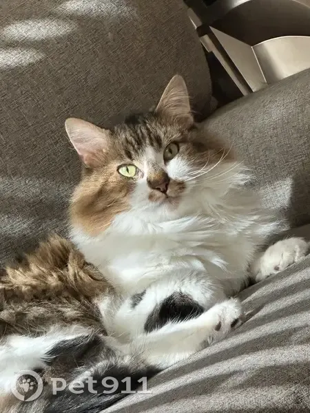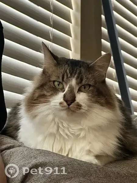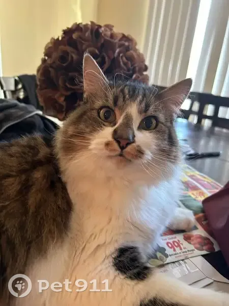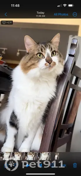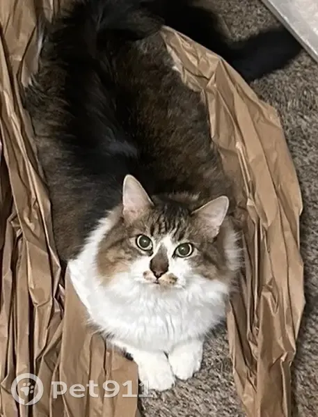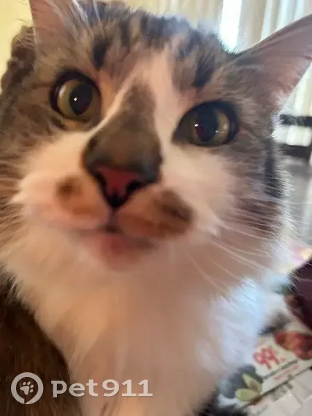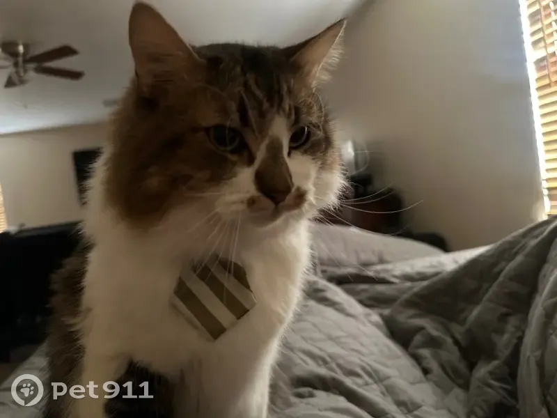 White belly and feet, feet have black and brown spots. Black and brown tail, black and brown back. His face is white and brown with black streaks. A brown nose with a brown mustache. He is a larger cat. He’s social and friendly even with strangers. He’s lite on his feet so he may have snuck out when groceries were brought in and the door may have been open a little too long.