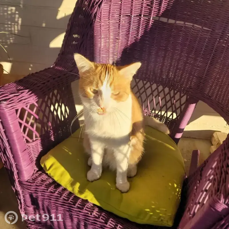 2 yo Male, orange tabby with white chest & front paws. A smudge of orange on his mouth. Fiesty, curious and has habit of getting in cars. He's chipped.
