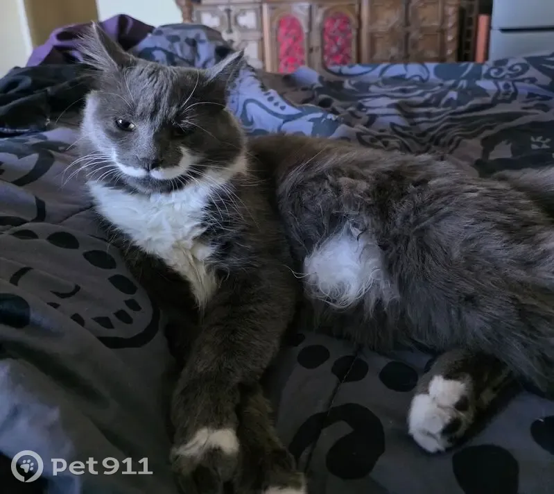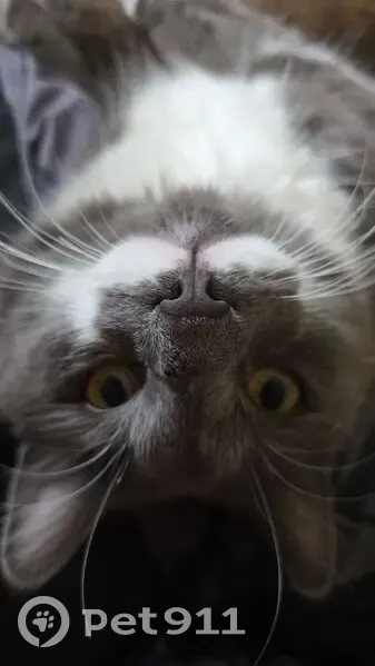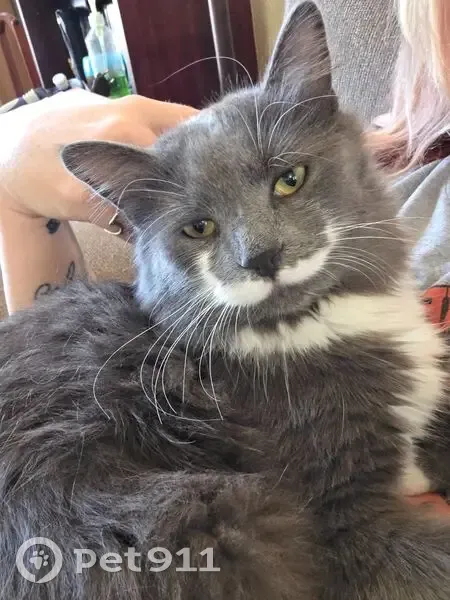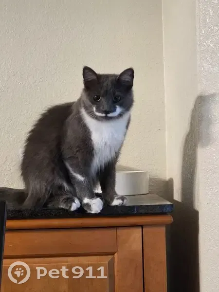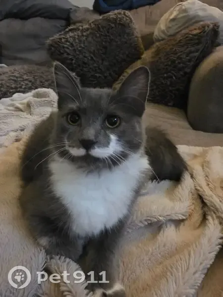 Dante is predominantly gray with white on his belly, all four paws are tipped white and he has a distinctive white mustache and has a fluffy tail. He is an indoor/outdoor cat, so the last time he was seen was at home.