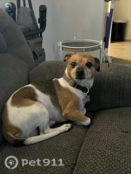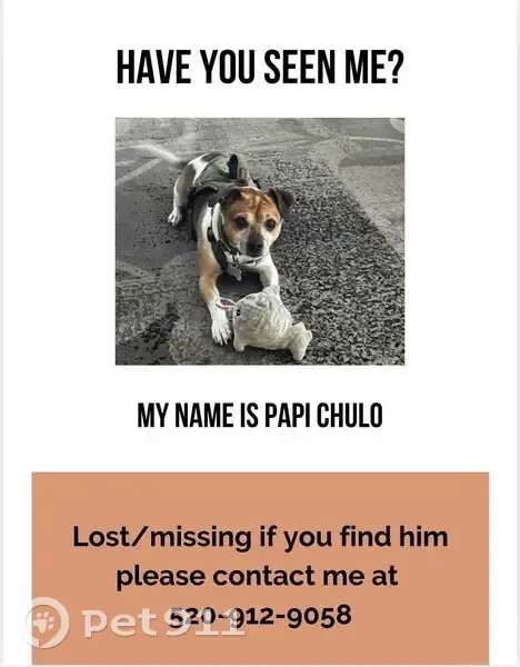 Chihuahua/Beagle mix 4 yrs old weighs about 10 - 15 lbs Took off from home Has a limp on his right back leg when running and front paw is sensitive due to an old injury Very loveable and likes attention Had on a green harness with his silver bone tag on it His name on one side my phone number on the other He answers to Papi mainly